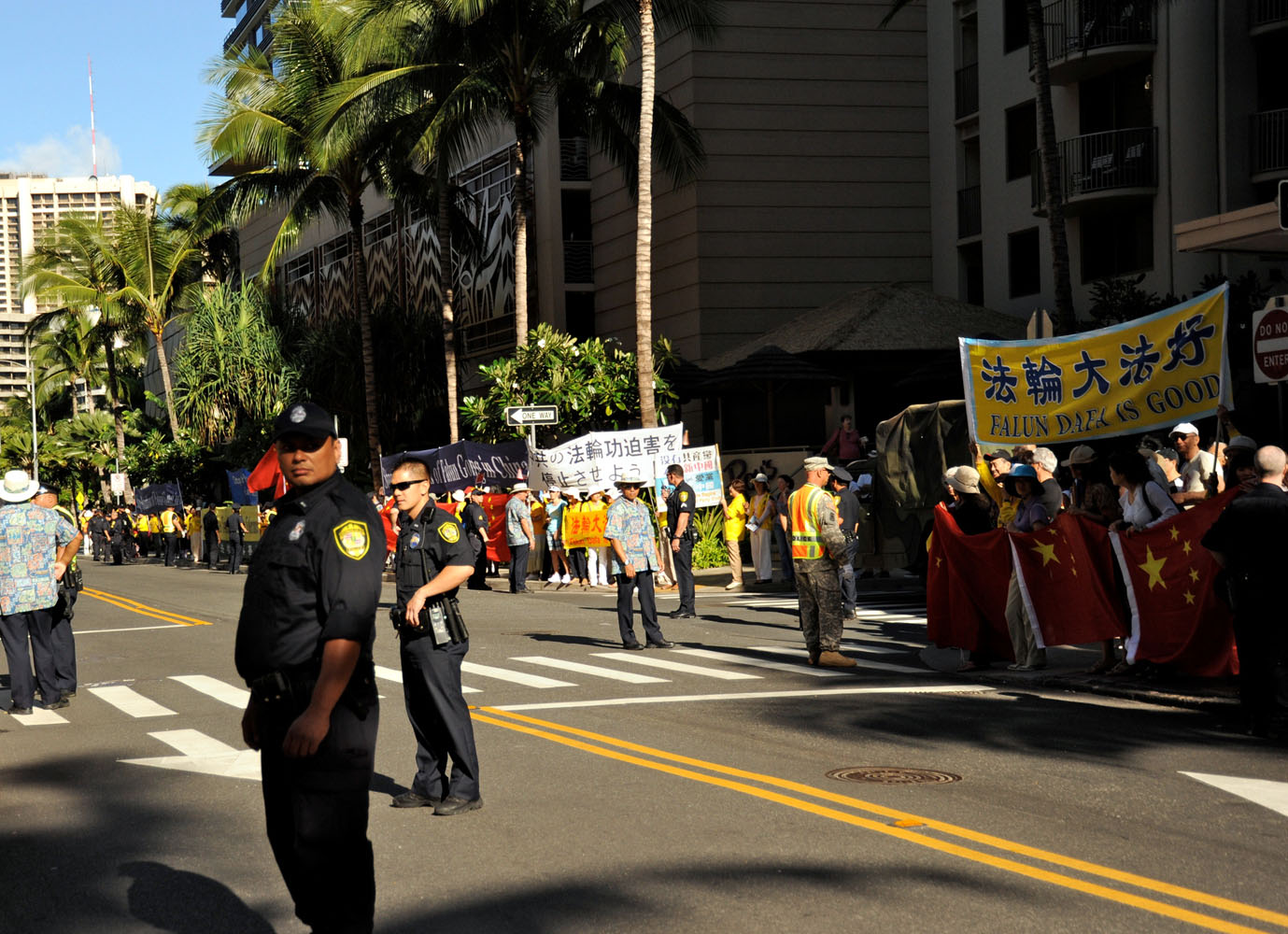 活动的过程中,不时有中共特务在附近监视法轮功学员的行动、拍照。当员警发现之后,也拿起相机对着特务拍照。有趣的是,法轮功学员各个都站得笔挺的,见到相机脸上都挂着微笑,反而中共特务一见到相机就连忙闪躲。在夏威夷会展中心外,更有四个冒充是法轮功学员的中共特务在现场捣乱。即便他们也身穿印有“法轮大法好”字样的黄色上衣,警察仍然看得出来他们与法轮功学员的言行举止不一样,将他们从法轮功的队伍中请出,带到离法轮功学员一段距离的地方。员警表示,那几个人没有法轮功学员那种善良祥和的样子。隔天,这四名特务又现身在威基基热闹的大街上,员警一眼就认出他们,并早早将他们阻隔在法轮功学员活动的几条街外,过后还主动跟法轮功学员说:“放心,所有的警察都知道他们了,我们会在这里保护你们。”