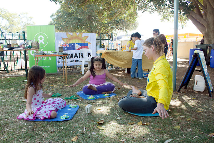 南澳法轮功学员应邀参加了这个多元文化节。中午时分,第一个节目就是法轮功学员展示功法。九个学员站好队形,有年老的也有年轻的,有亚洲人也有西人,当舒缓的炼功音乐一响起,就吸引了人们的目光。