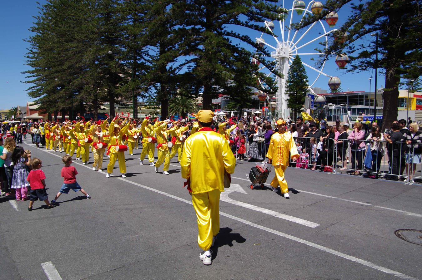 “法轮大法”横幅在游行队伍的最前面,其后是墨尔本法轮功学员组成的腰鼓队,他们身穿金黄色炼功服,伴随着“法轮大法好”音乐,传递着真相,浩浩荡荡地穿越了阿德雷德的三大社区。