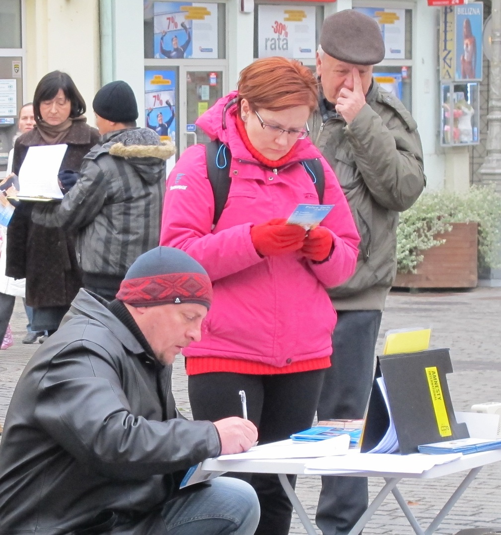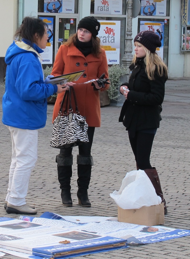 四个小时过去了,几百名凯尔采的市民听到了真相,其中有二百三十多人在征签簿上签名反对中共对法轮功的残酷迫害,征签台太小,很多人就在法轮功学员的手中征签簿上直接签名;还有很多人拿着法轮功传单表示回家后要上网进一步了解法轮功,他们会在明白真相后在网上征签簿上签名。