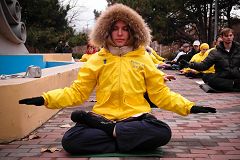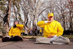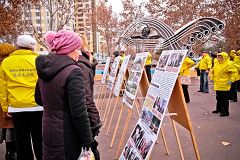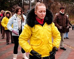 在功法展示活动中,学员优美的炼功动作以及祥和的场面吸引了许多路人驻足观看,人们纷纷接过真相报纸,认真阅读。