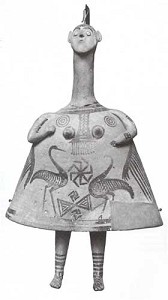 西亚的新石器时代,伊朗的巴昆遗址,出土了不晚于公元3500年前的彩陶,有女神陶像,她的肩上有卍字符。在古希腊文物中也多次发现刻有卍字符的神像或器皿。(图:希腊钟型女神、谷物罐、扣型饰物等))