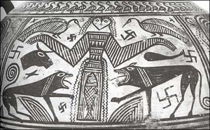 ![]() 罗浮宫收藏2700年前刻有卍形图案的古希腊扣型饰物 | ![]() 古希腊陶绘上的卍字符(网络图片) |