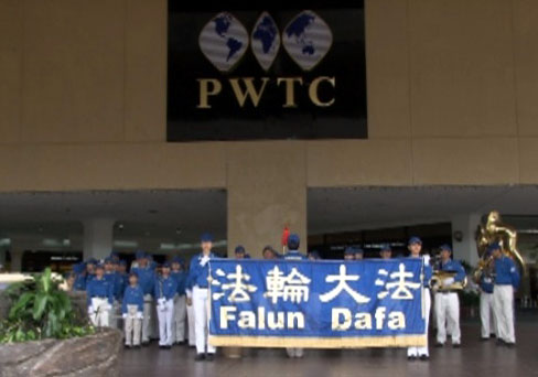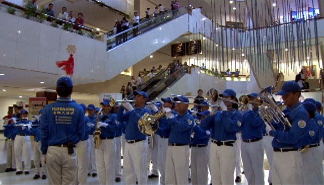 隔天(十八日)下午一时三十分,身穿蓝衣白裤的天国乐团成员整齐地集合在吉隆坡太子世界贸易中心正门口,接着以整齐的步伐走入大厅开始了第一轮演奏。庄严的《法轮大法好》乐曲首先响遍了整个大厅,吸引民众止步观赏与拍摄。