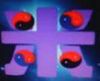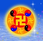 “两弓双乙知牛马”,双乙是乙+乙=卍,“卍”就象两个“乙”字交叉在一起。两弓是两张弓,太极的阴阳鱼象两个月牙,又象是两张弓合在一起。两弓双乙就是指太极和 “卍”。知牛马,“卍”是佛家的符号,太极是道家的符号,自古以来佛道两家风马牛不相及,可是在法轮功的法轮里却同时出现了。