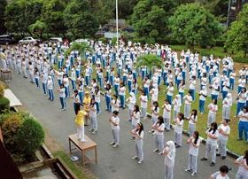 活动于早上七点开始。学生们排列整齐。学生和教师分开。两名法轮功学员一男一女站在前面桌子上展示功法,让所有参与者都能看到。其他学员为师生们纠正动作。
