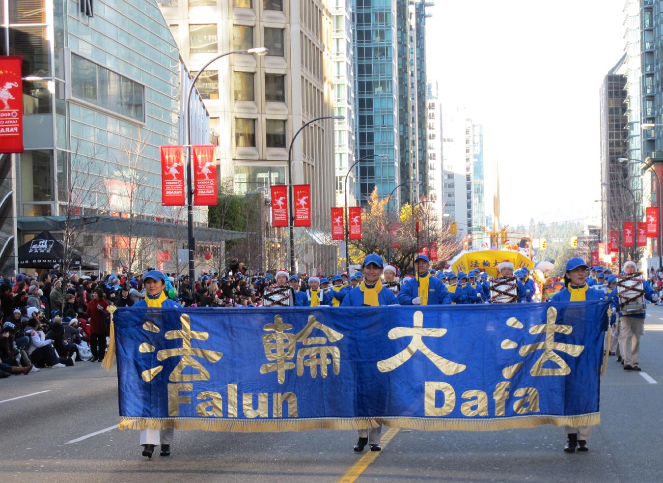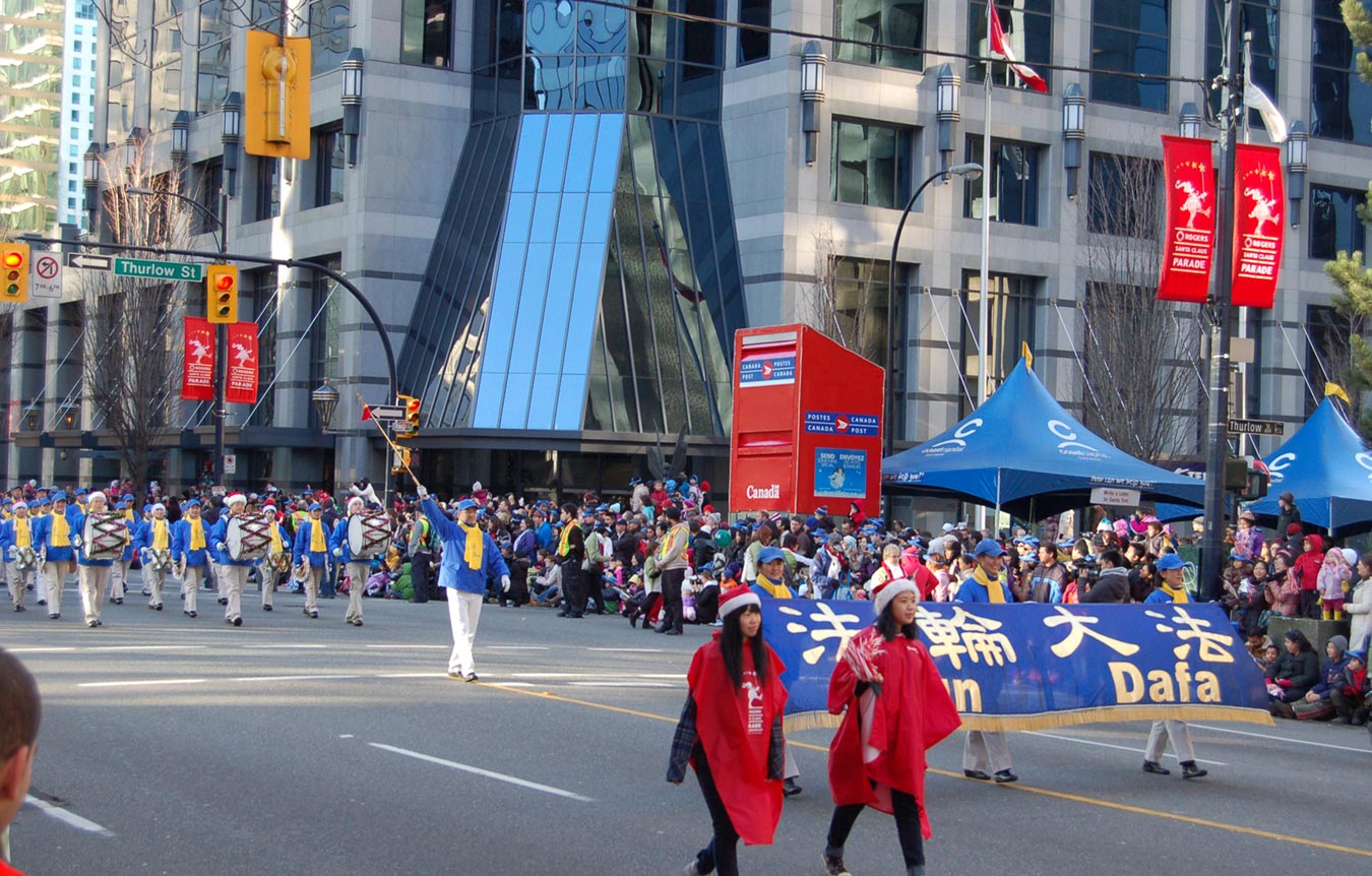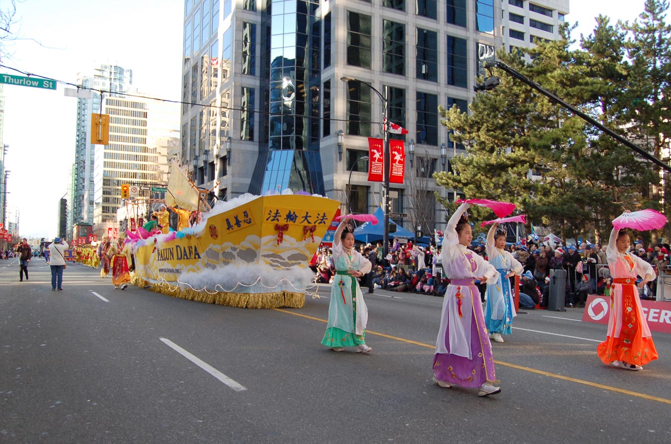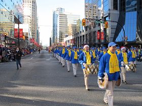 这天是温哥华难得的好天气,游行沿途的街道挤得真可称水泄不通。在六十多个游行队伍中,法轮功排在第九号,当食物银行募捐车队、军乐队刚过,远远就传来了法轮功学员组成的天国乐团的嘹亮乐声,天国乐团后面紧接着是舞姿优美的仙女,巨型花车“大法船”、腰鼓队和横幅“法轮大法好”殿后。