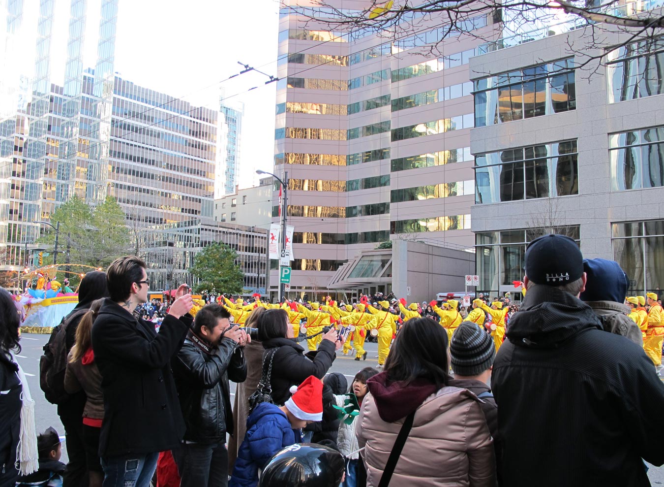温哥华是北美华人比较多的城市,新移民、老移民,许多家庭都是全家出动,扶老携幼看圣诞游行,看到法轮功的队伍这么亮丽,华人都是一脸兴奋和自豪。一名来自上海的移民很有感触地说:(法轮功)乐团很棒,尤其他们信仰的“真善忍”真好。
