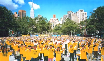 |  在联合国千僖年高峰会议期间,来自世界各地的约2000名法轮功学员在中国驻联合国使团驻地前炼功请愿,要求停止迫害法轮功。 |