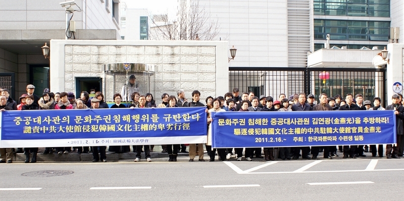 【明慧网二零一一年二月十八日】二零一一年二月十六日上午,韩国“爱国市民团体协会”、韩国法轮大法学会和釜山市民百余人在中共驻釜山领事馆前举行抗议集会,呼吁将侵害韩国文化主权的中共驻韩国釜山总领事馆副总领事金燕光驱逐出境。