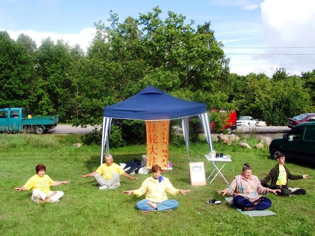 二零零三年五月二十三日、二十四日,法轮功学员参加在爱沙尼亚首都塔林举行的大地节(Mother Earth Fair)。祥和的音乐及美妙的气氛,吸引许多人驻足观看学员的功法展示。
