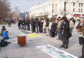 - 保加利亚民众关注在中国发生的迫害(图)- 为了庆祝中国的兔年新年,二零一一年二月十三日这天,法轮功学员在保加利亚普罗夫迪夫市的市中心广场上,向当地民众展示优美的功法,并向民众讲述中共当局已经持续了十一年对法轮功修炼者的残酷迫害。