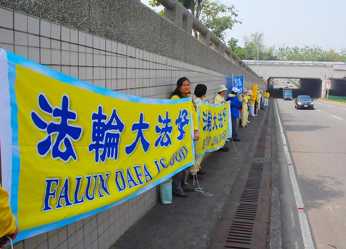 法轮功学员在耐斯王子饭店前的世贤路地下道进出口,及车潮汹涌的忠孝路上拉起法轮功真相横幅,赢得过往民众的赞许。一位企业主停下车来打开车窗,特别为法轮功学员加油。