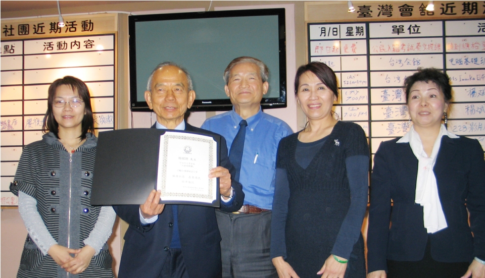 台湾会馆理事长蔡明峰先生(中)颁发褒奖给杨斌德先生(左二)。