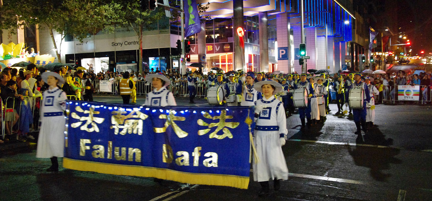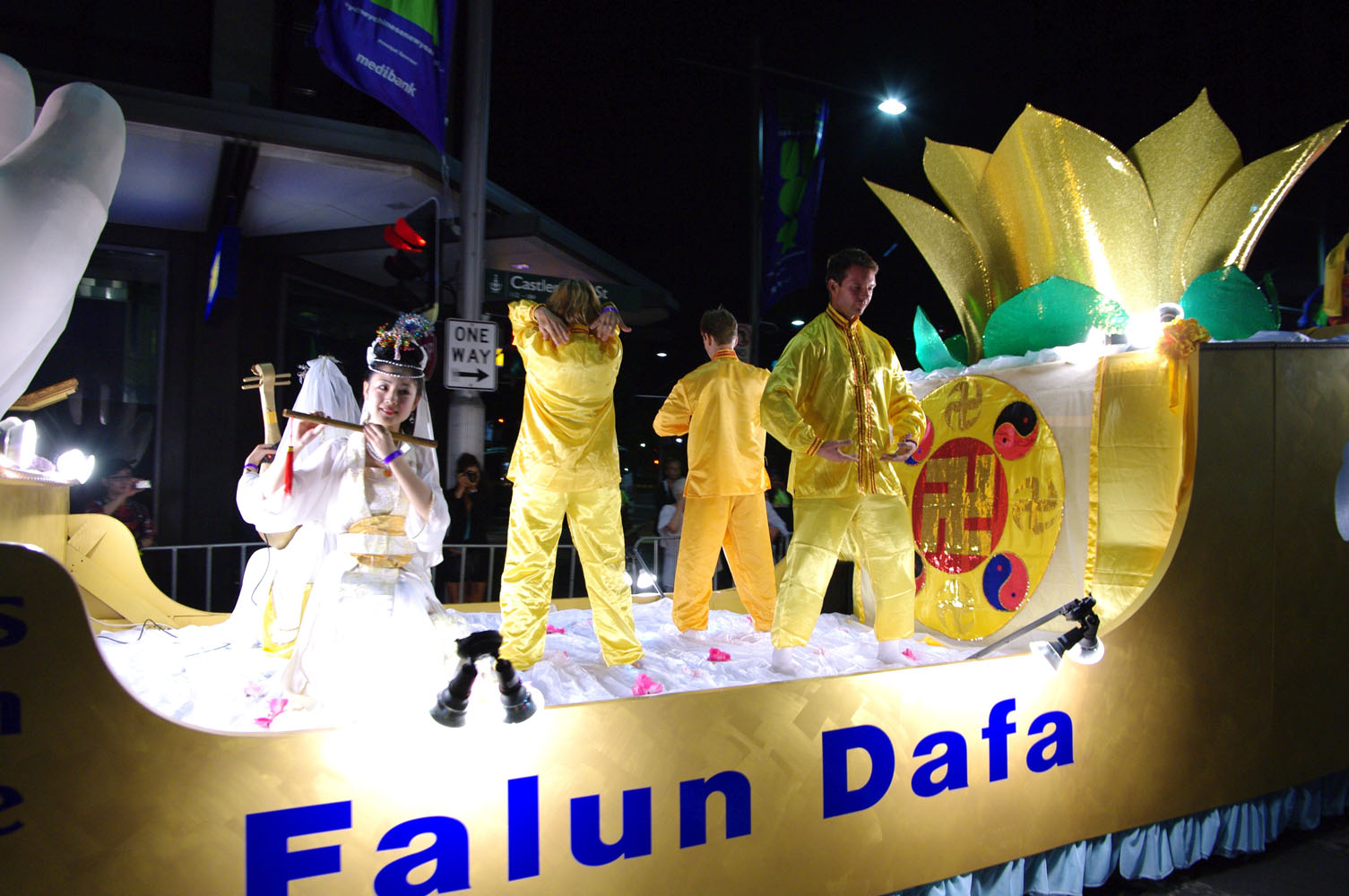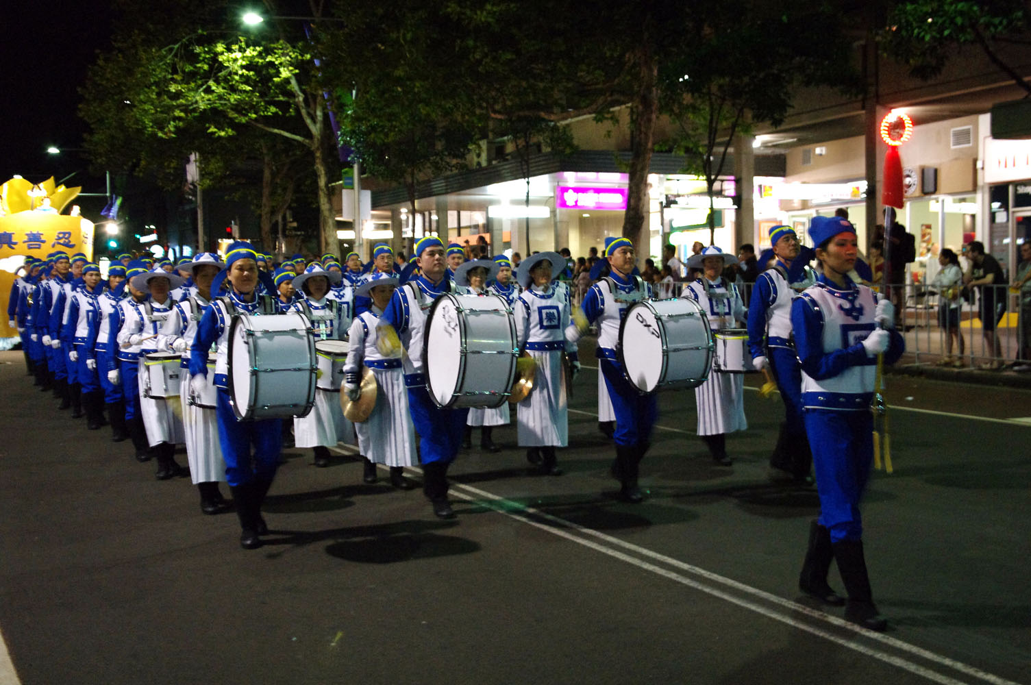 悉尼法轮功学员们身着整齐的蓝白色古装乐队服装,精神抖擞地参加了这个有着上百个团体的游行队伍,由法轮功学员组成的悉尼天国乐团多次参加各种社区活动,并曾获得各类褒奖。紧跟其后的是精心制作的金色的法船,学员们在载着金色莲花的法船上展示祥和的五套功法。
