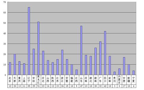 2010年1月至2011年1月非法判刑案例各省分布表,纵坐标代表判刑人数