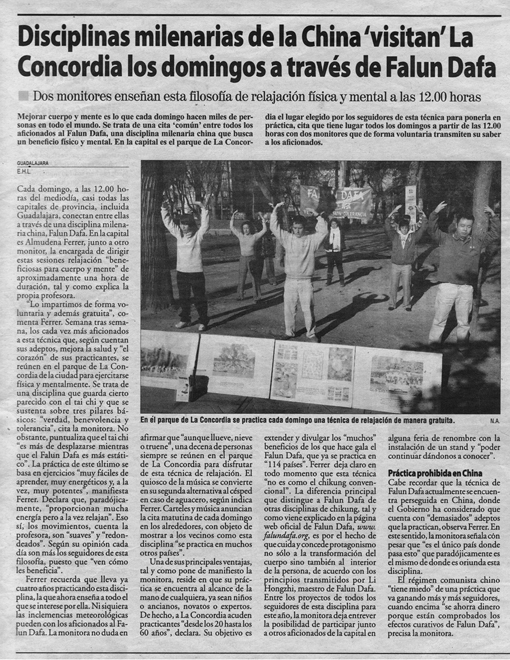 当地最大的报纸《Nueva Alcarria》也前来采访,并在之后以大篇幅介绍了法轮大法——这一历史悠久、名扬全世界的有益身心并且简单易学的功法。报道中说:“法轮大法是一个放松精神、强身健体的古老的修炼功法,法轮大法有三个基本原则:真、善、忍;同时有五套功法,虽然动作简单,但能量场却非常强大。在瓦德拉哈拉市中心的公园里,每周日上午十二点会有很多的人来这里炼功,有两位教功人在这里义务教授功法,来这里炼功的人每个人都能感受到身体和心灵的提升。”