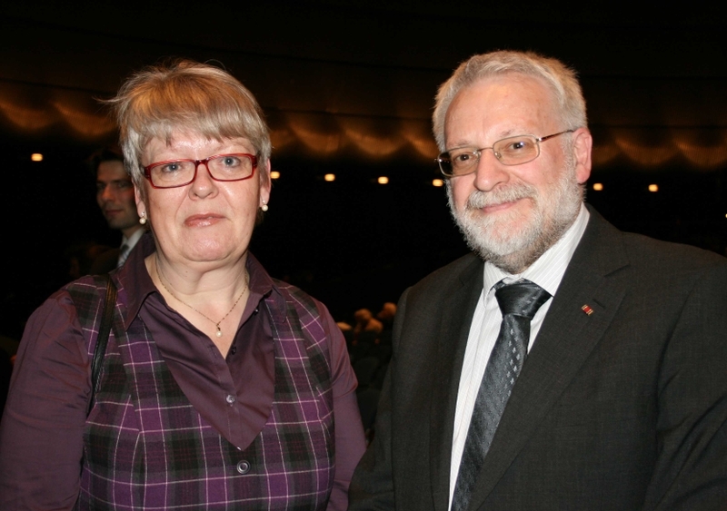 在二十七日下午的演出中场休息期间,观众们来到乐池边,兴致盎然地探寻那些奇妙的中国传统乐器。国际人权协会(IGFM)主席卡尔‧哈芬(Karl Hafen)先生和夫人也乐在其中。