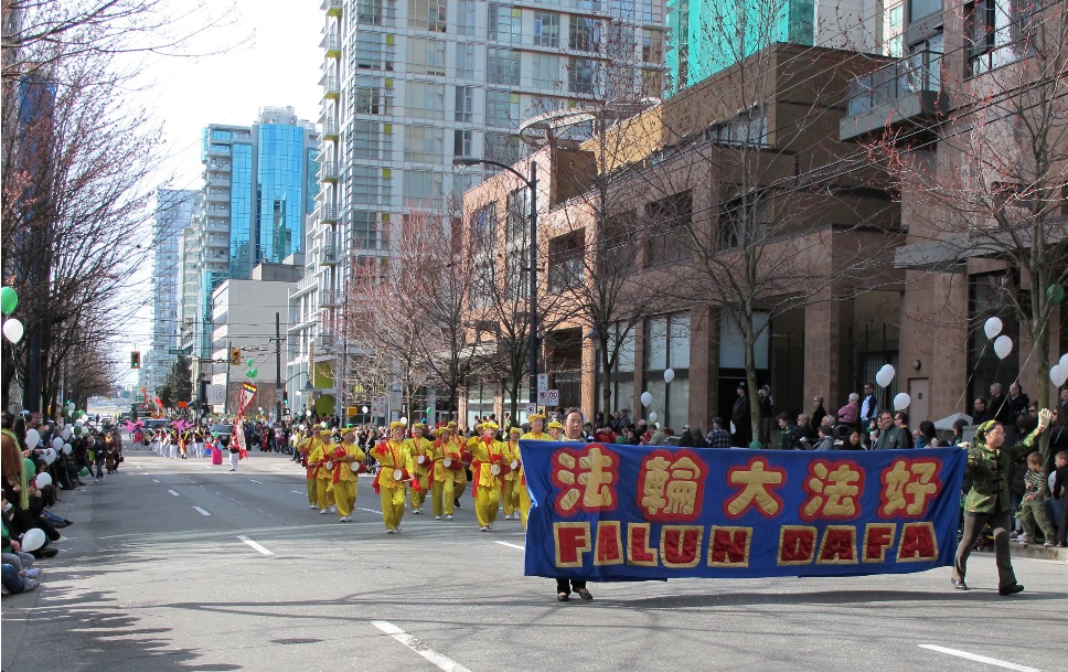 ![]() 温哥华圣派翠克节游行中的法轮功腰鼓队 |
