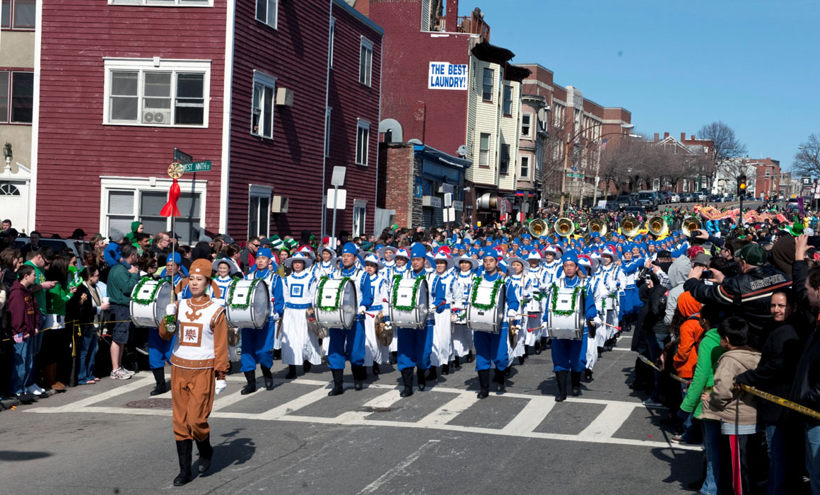波士顿圣派翠克日游行是全美第二大的圣派翠克日游行,许多华裔也争相前往观赏。刚由大陆来美求学的卢小姐,看到天国乐团的团员们英姿飒爽,在海外为华人争光,非常激动。