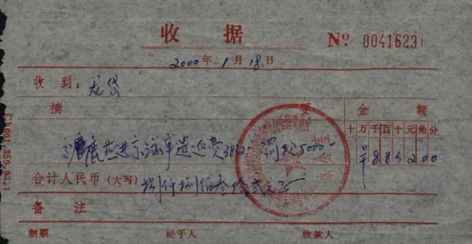 ![]() 四川省社会科学院历史研究所龙岱先生,因妻子鹿燕到北京为法轮功上访,被强取所谓“遣返费”3832元及无理罚款5000元的收据。 |