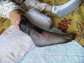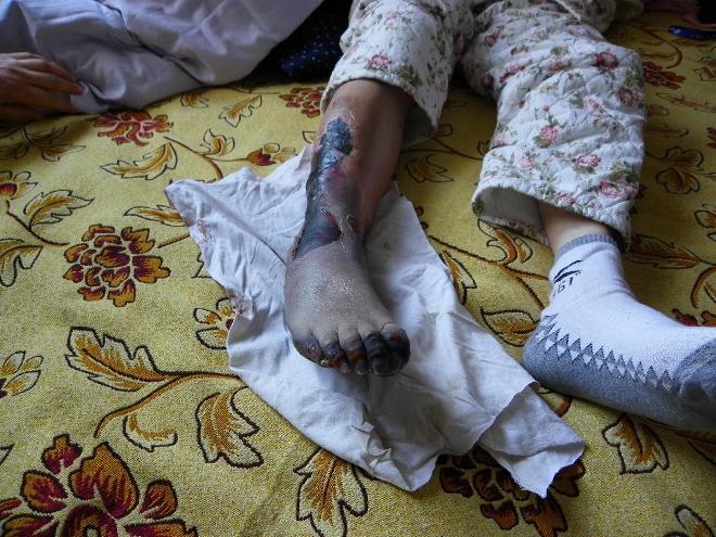 宋会兰是被家人从看守所抱出来的。当时的宋会兰身体僵直、眼神发呆、不会说话,手、腿直挺挺的,不能回弯,象木头人一样,没有任何反映和知觉(当时家人只看外表这样,还不知腿和脚的实情)。回到家后,家人才发现,宋会兰的右腿以下,脚面、脚趾全部坏死,呈黑色,淌黄水,摸上去硬邦邦的,象铁板一样,一敲呯呯响。