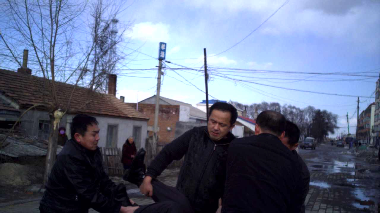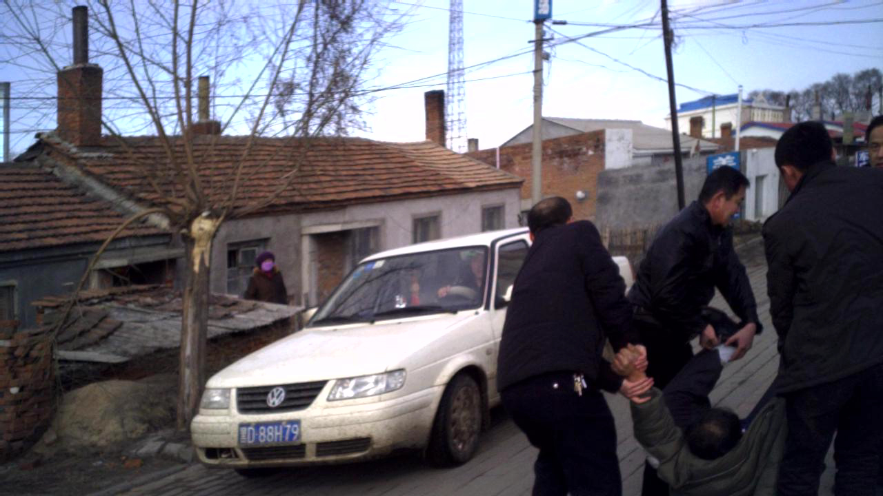 四名便衣抓住李少铁的四肢正在往车上拖拽