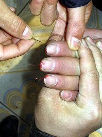 最后把黄成放下来时,大队长管凤春又把他的衣服扒光,铐在铁椅子上,用电棍一会儿电一电。管凤春还逼迫黄成骂人,他亲自“示范”,一骂三个小时,全是非常低级下流的脏话。管凤春还指使孟祥林等犯人将黄成双手铐在墙上,将他每个手指尖插进一根医用的大针头,整整插了十根!针是从指甲与肉之间扎进去的,血从另一端流出;有的针从指甲缝扎进去又从另一指节间穿出,血就从针头流出;有的针扎进针尖被堵塞拔出后出血。直到黄成离世时,他的指甲盖内仍留有疤痕……