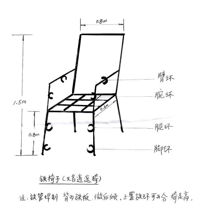 ![]() 刑具“铁椅子”:由铁管焊制,靠背为铁板。受刑者身体被完全固定在椅子上不能动 |