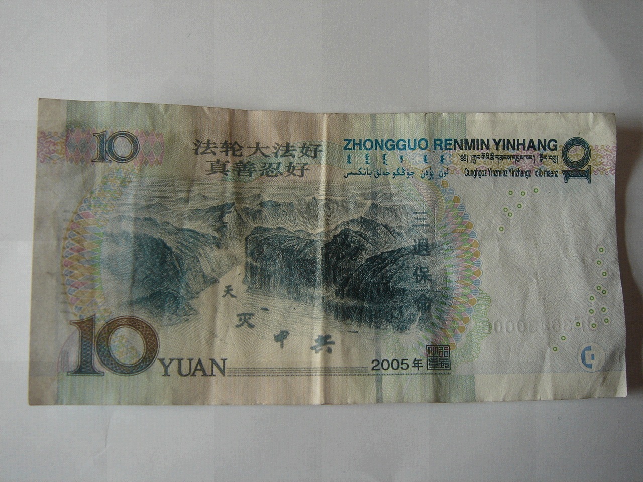 十元钱的设计思路:在重要位置体现出“法轮大法好,真善忍好”,然后顺着河流淌出四个字“天灭中共”,右侧是对世人的忠告“三退保命”。
