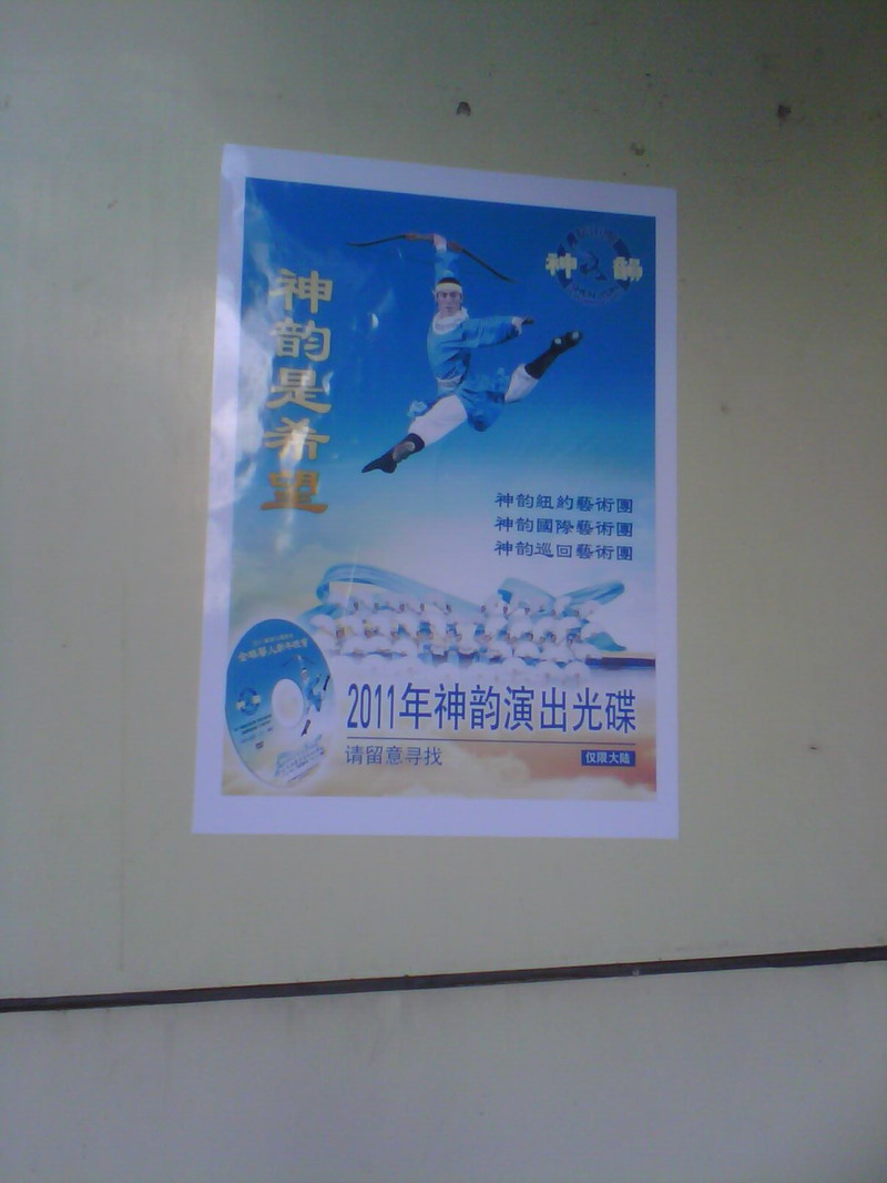 【明慧网二零一一年三月八日】近日,云南某地街头出现大量神韵晚会海报,还有法轮功真相光盘,以及揭露中共邪恶本质的不干胶,令市民们眼前一亮。