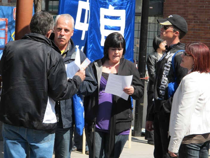 【明慧网二零一一年四月十一日】(明慧记者肖妍蒙特利尔报道)二零一一年四月九日,春光明媚,经过漫长严冬的蒙特利尔民众纷纷走上街头,享受期盼已久的春天的到来。蒙特利尔的唐人街更是热闹非凡,法轮功学员与当地民众在中山公园举办声援九千二百万中国民众三退(退出中共党、团、队)集会,并现场为过往华人提供三退服务。