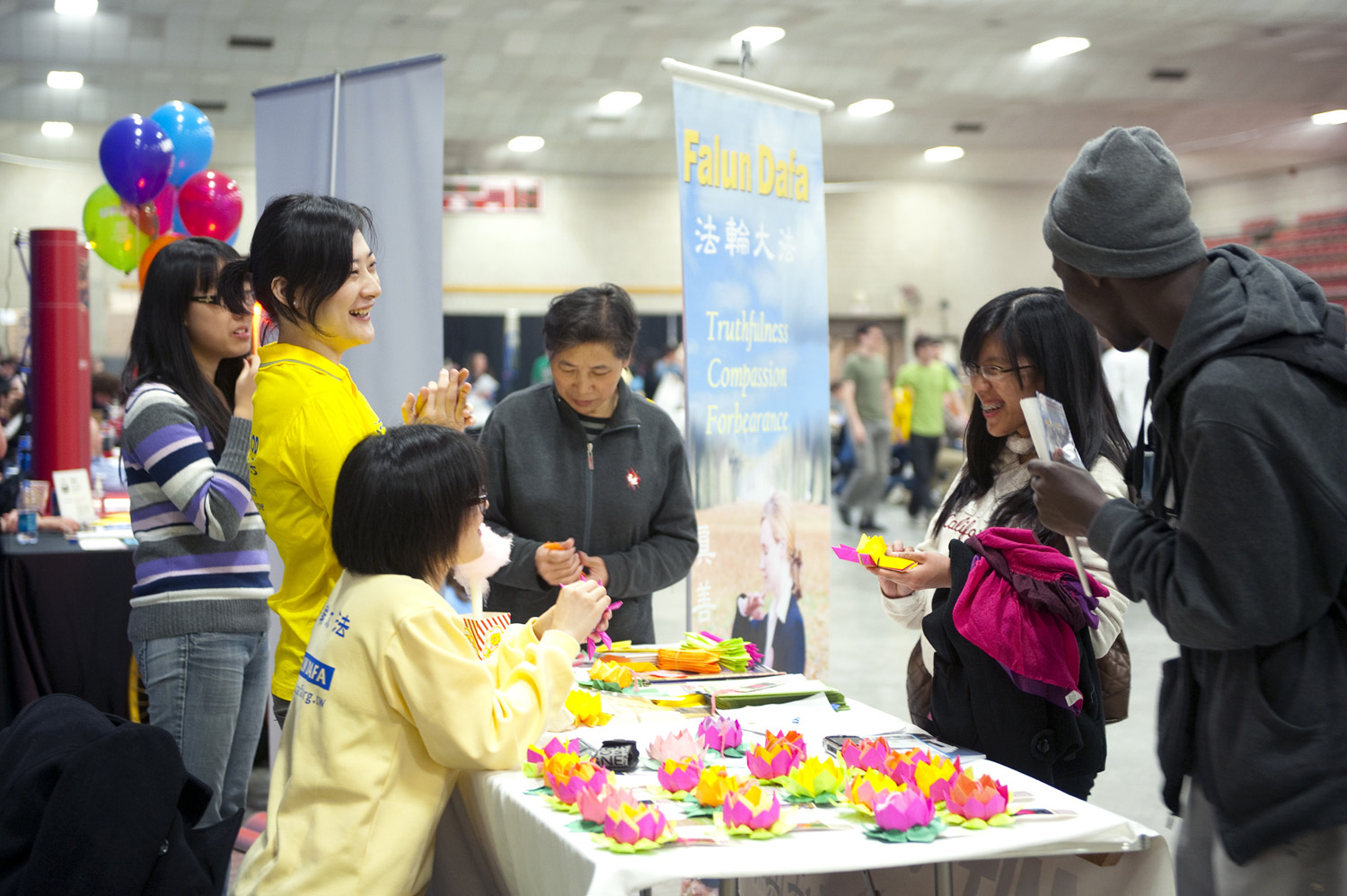 【明慧网二零一一年四月十二日】二零一一年四月八日,美国麻省理工学院录取的新生和家长来参观学校。周四和周六,法轮功(又称法轮大法)学员两次在上千人参加的学生活动中设置展位,介绍法轮功和麻省理工学院法轮大法俱乐部,并且在舞台上展示了五套功法,讲述中国大陆法轮功学员无辜遭迫害的情况。