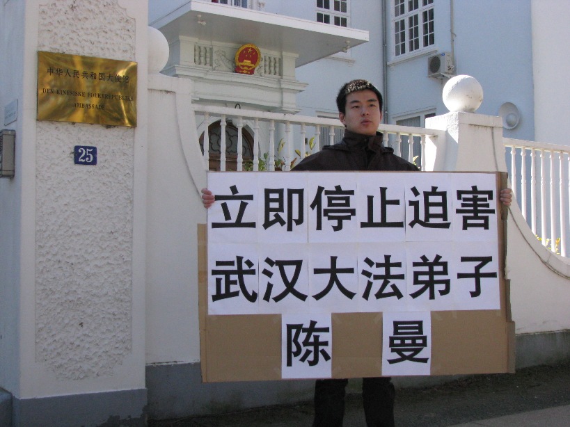 丹麦法轮功学员在中领馆前要求中共当局立即释放陈曼,并谴责中共恶党对法轮功持续近十二年的残酷迫害,呼吁中使馆人员认清恶党反人类的邪恶本性,早日退出中共邪党,看清形势,三退(退出中共党、团、队)自救。