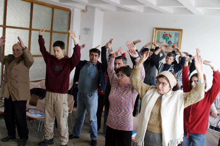 |  罗马尼亚的土尔努•瑟维林城(Turnu Severin)民众学习法轮功第二套功法 |