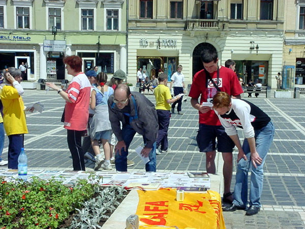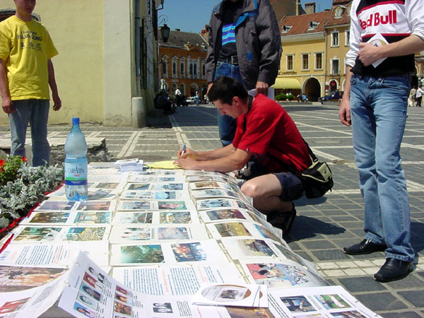 二零零五年六月四日,罗马尼亚法轮功学员来到一个美丽的旅游城市布拉索夫(BRASOV)炼功弘法。学员向过路的游客发送资料介绍法轮功,并揭露中共残酷迫害法轮功学员的真相。明白真相的游客纷纷在留言簿上签名,声援法轮功,呼吁制止中共暴行。