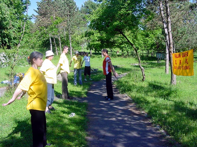 |  罗马尼亚法轮功学员建立炼功点,教导新学员炼功。 |