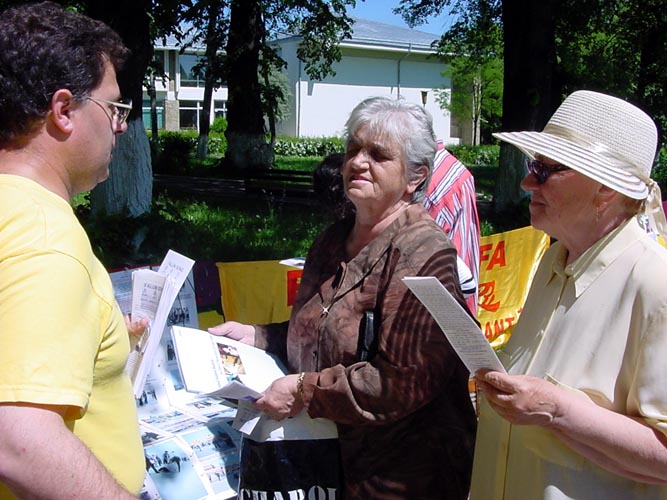 二零零五年五月二十八、二十九日,罗马尼亚法轮功学员到SUCEAVA城弘法,在公园里向游人发放讲述法轮功在中国横遭迫害的真相材料,让更多的人知道世界需要“真、善、忍”。