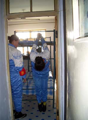 四、桂阳一法轮功学员,因拒绝穿囚服,被坏人用巴掌打耳朵,用绳子捆绑,用胶纸封住嘴巴,坏人还和狱警说,把她的衣服和短裤全扒光,然后喊人来拍照 ……后来把她吊铐在楼顶上关禁闭半个月。六月的天气很热,监狱不给水喝,每天只给一点饭,让人有一口气,不死就行了。她从禁闭室出来时,神志已经变的不清醒。