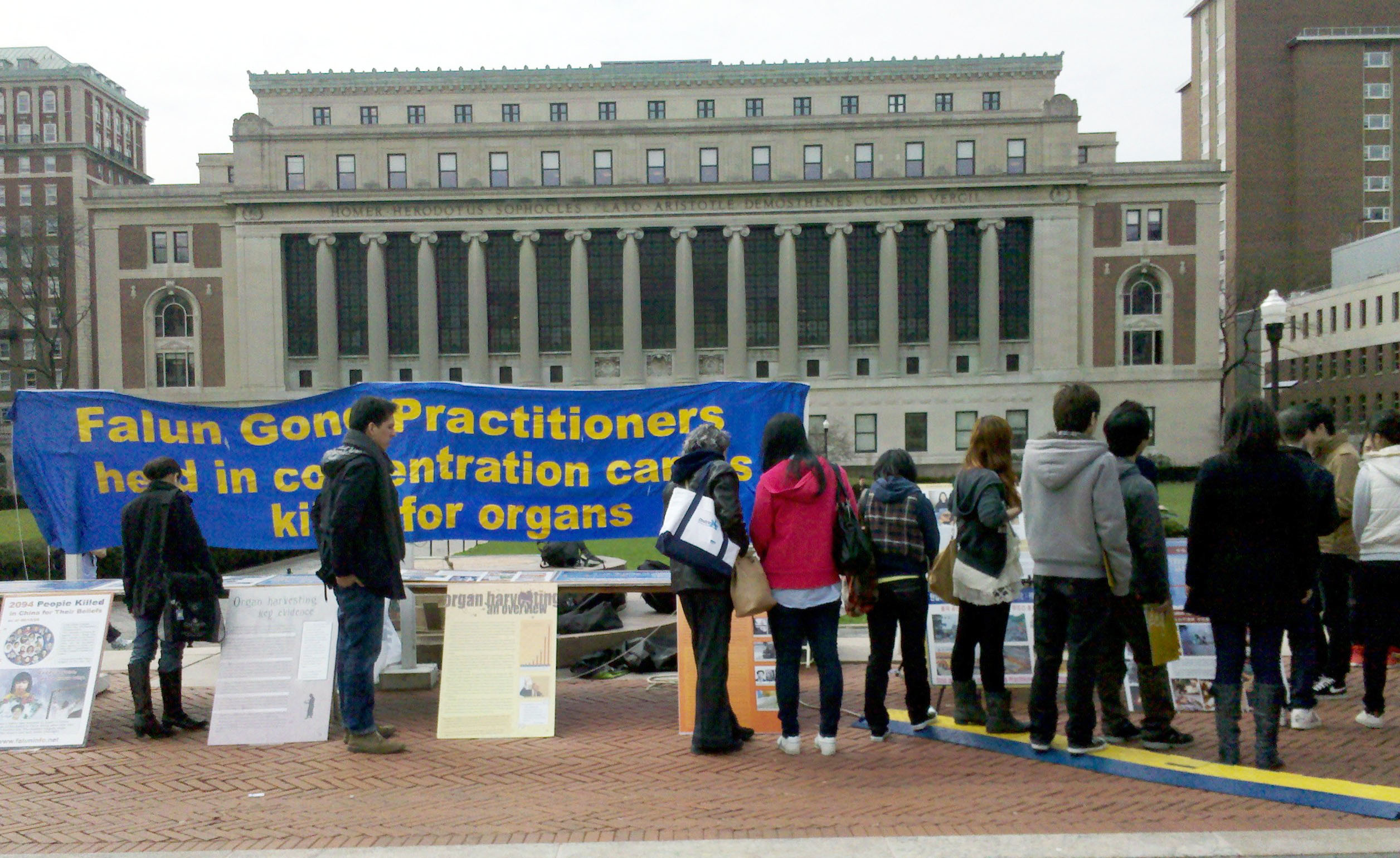 哥伦比亚大学是美国著名的常青藤学府,始建于一七五四年,位于纽约曼哈顿哈德逊河畔。真相展设在大学校园内的最佳视野处,一进大学校门,就可以看到硕大的英文横幅“法轮功学员被关押在集中营,器官被摘取”和一幅幅大型真相展板。展览分为法轮大法简介、迫害真相和《九评共产党》三部份。