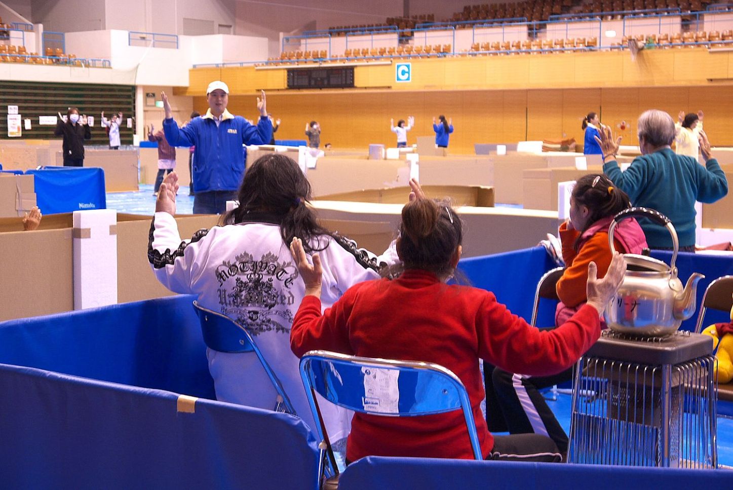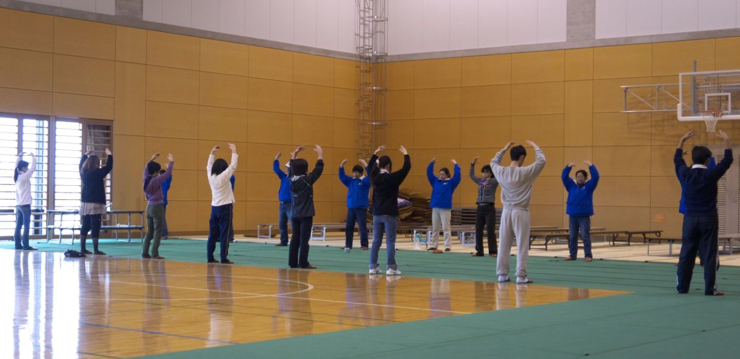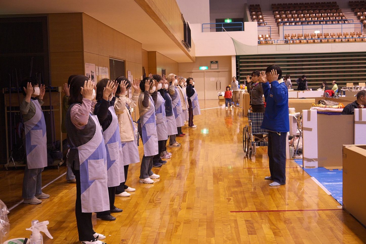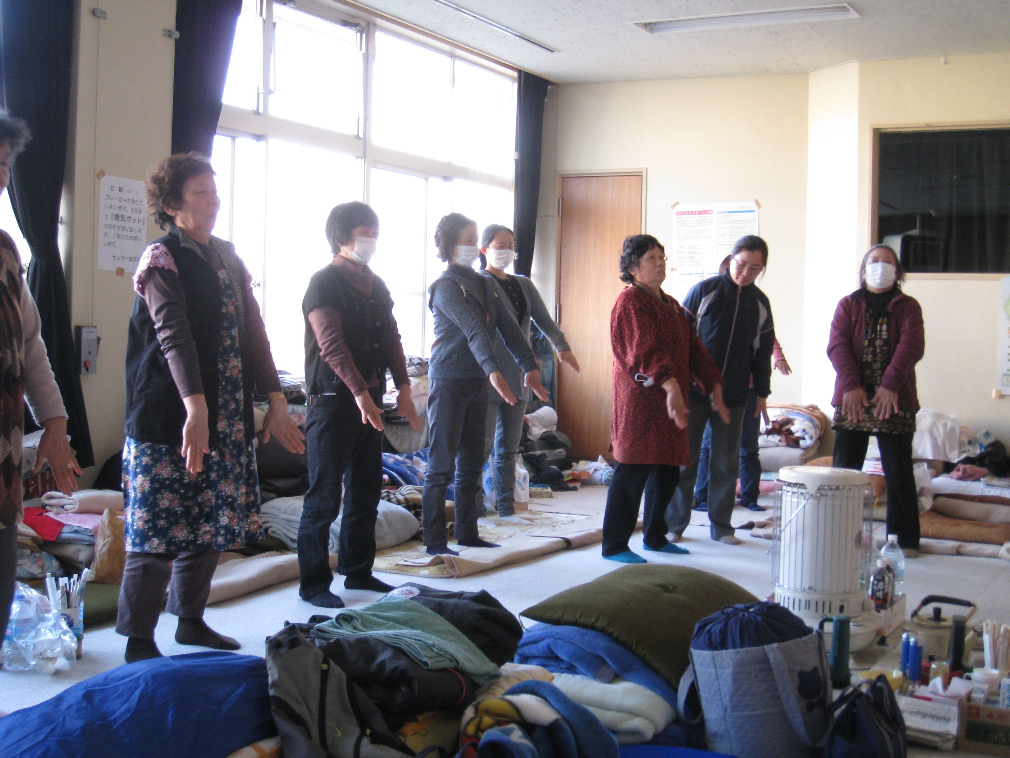 ![]() 法轮功学员在名取市避难所教授法轮功功法 |