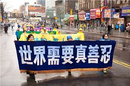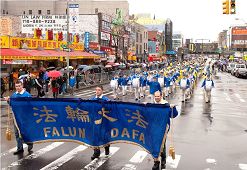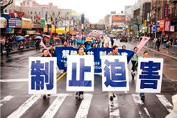 尽管一直断断续续地下雨,法拉盛街头还是沸腾了。上千人的队伍,跨越几个街口,神龙见首不见尾。游行队伍分为三部份:首先是“大法洪传”,由天国乐团开路。雄壮的乐曲犹如千军万马响彻在法拉盛华人最热闹的缅街上空。接下来是“中原蒙难”,肃穆的法轮功学员捧着被迫害致死同修的遗像,叙述着法轮功学员不畏强权,坚守真理,惊天地泣鬼神的传奇。第三部份是“三退保平安”,各方民众欢呼雀跃,争先恐后地退出中共党团队,为自己的生命开创着最美好的未来。