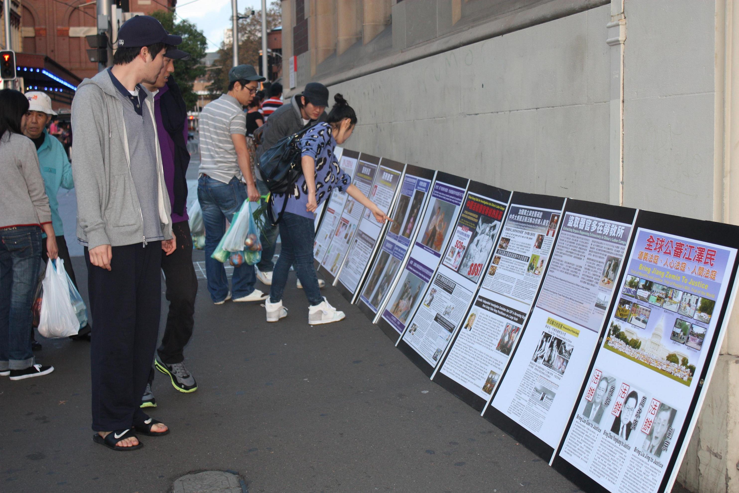 十二年后的今天,法轮功学员们在悉尼唐人街拉起了大型中英文横幅,打出了“法轮大法好”、“世界需要真、善、忍”、“法办江泽民、法办刘京、法办罗干、法办周永康”、“中共邪党盗卖法轮功学员器官”等信息,抗议中共多年来对法轮功学员施以非法关押及酷刑迫害。并在路旁前摆满了各种真相展板,吸引不少路人驻足观看。