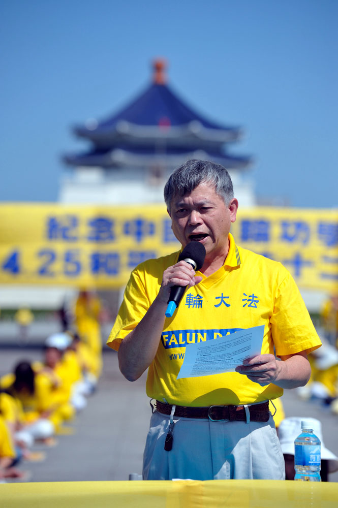 台湾法轮大法学会理事长张清溪在发言中说,在中共极权统治下的社会要表达基本人权是需要相当大的勇气。上万的法轮功学员“四二五”和平、理性上访,是大勇、正义、纯善与坚忍的表现。今天台湾法轮功学员在此集会,除感念他们的义举外,学员仍将秉持这样的精神,坚持向世人讲清真相,破除中共谎言的迷惑,制止迫害,共同走向美好的未来。