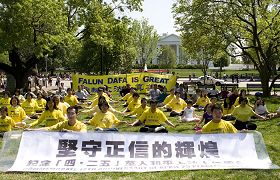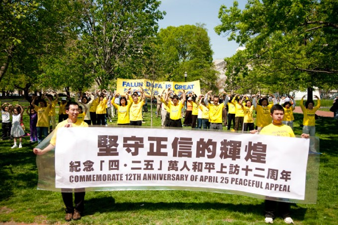 华府法轮功学员、美国天主教大学机械系系主任聂森教授说:“十二年来,全世界一百多个国家和中国大陆的法轮功学员秉承四·二五所展现的善良和坚忍,展开史无前例的讲真相、反迫害努力。”