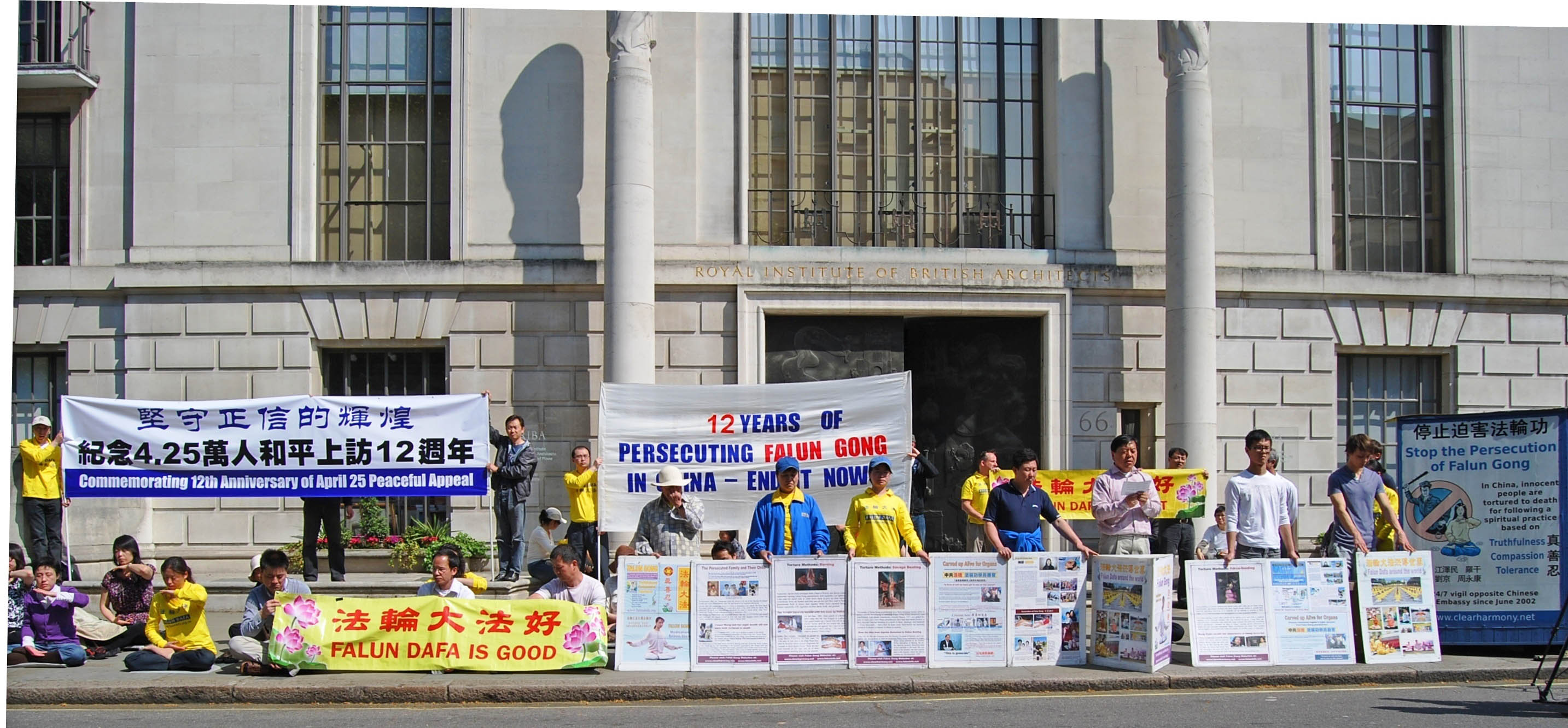 二十五日中午,法轮功学员们在伦敦中使馆前集体炼功。之后,学员们拉起横幅,摆开展板。中英文横幅上写着“坚守正信的辉煌——纪念四•二五万人和平上访十二周年”、“法轮大法好”、“发生在中国的对法轮功的迫害已达十二年——立即停止!”