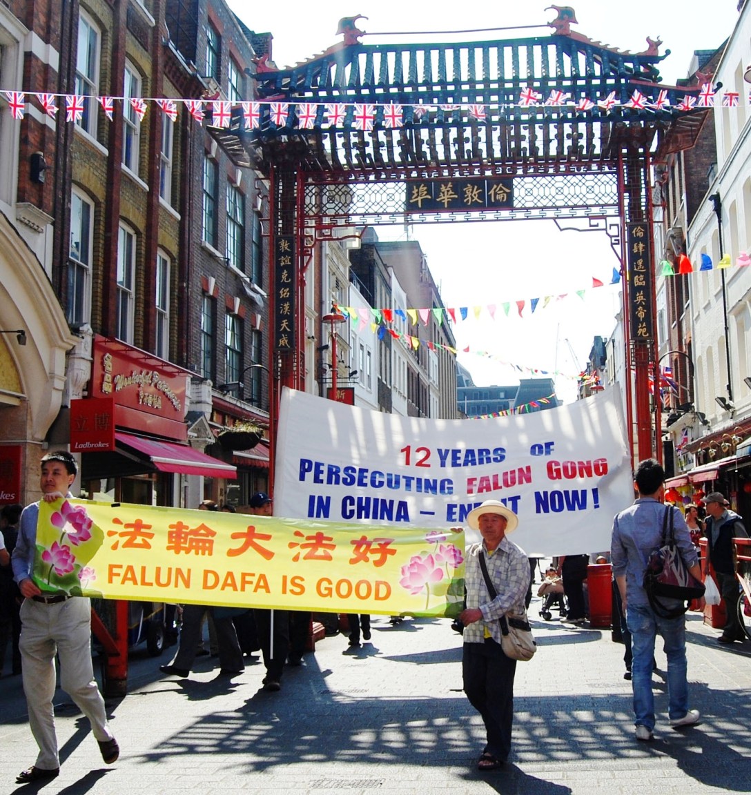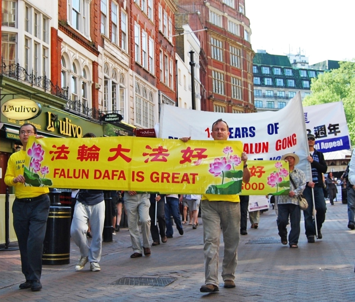 法轮功学员在伦敦游行,纪念“四•二五”,传播真相