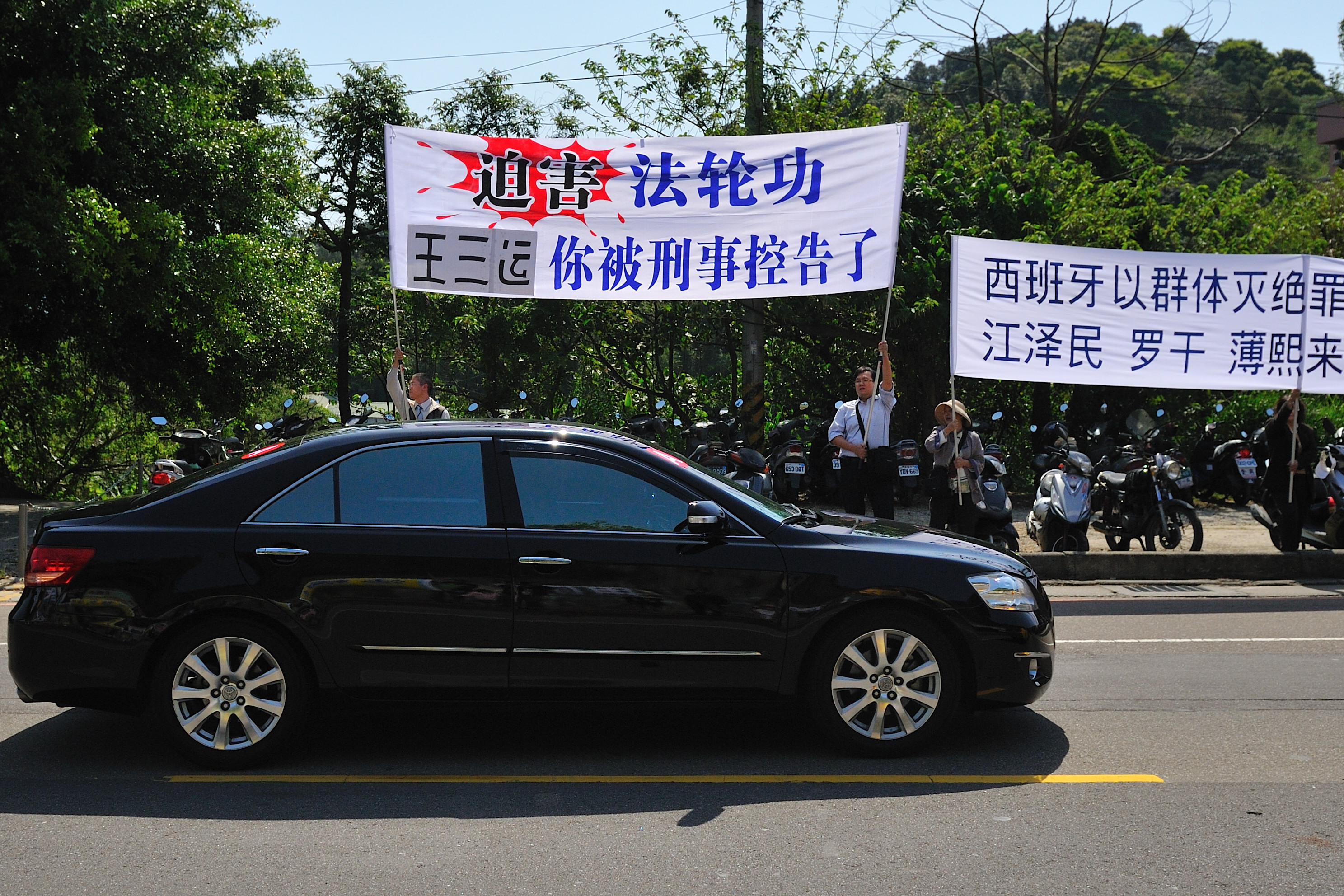 在大陆横跨福建、四川、安徽三省严重迫害法轮功的王三运,曾亲自指挥四川的所谓“狂飙F行动”大规模抓捕法轮功学员。二十五日下午一点四十七分,王三运现身机场,他在安全人员的重重包围下步入大厅,现场法轮功学员向他喊话:“王三运,你被告上法庭了。停止迫害法轮功,善恶有报。法轮大法好,真善忍好。”王三运不敢回应“被告”问题,匆忙走入海关,历时不到三分钟。