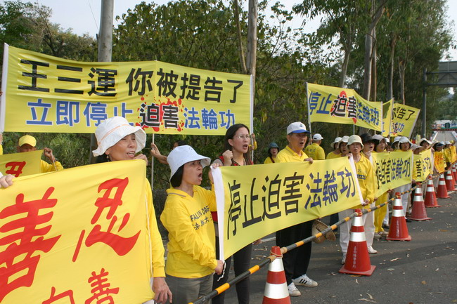![]() 台南市议员曾秀娟(左三)声援法轮功,一起拉横幅对王三运大声呼口号。 |