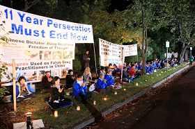 二零一一年四月二十五日晚六点半,墨尔本法轮功学员在中领馆大门一街之隔的草地上点亮烛光,竖起真相横幅,开始静坐抗议。不少来往车辆鸣笛表示支持和敬意。地方警察也依惯例在活动期间来到现场执勤。